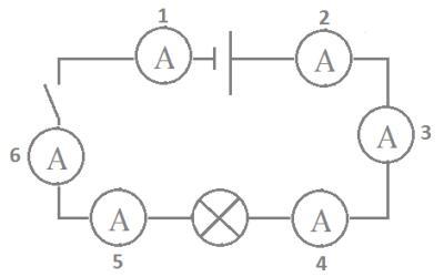 все амперметры соединены последовательно и должны показывать один и тот же ток