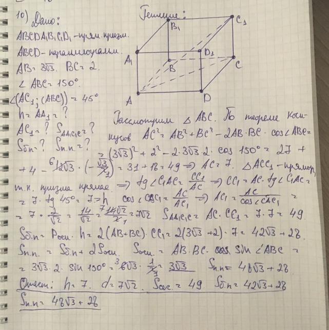 В основании прямой призмы параллелограмм со сторонами 3 корней из 3; 2 и углом 150°