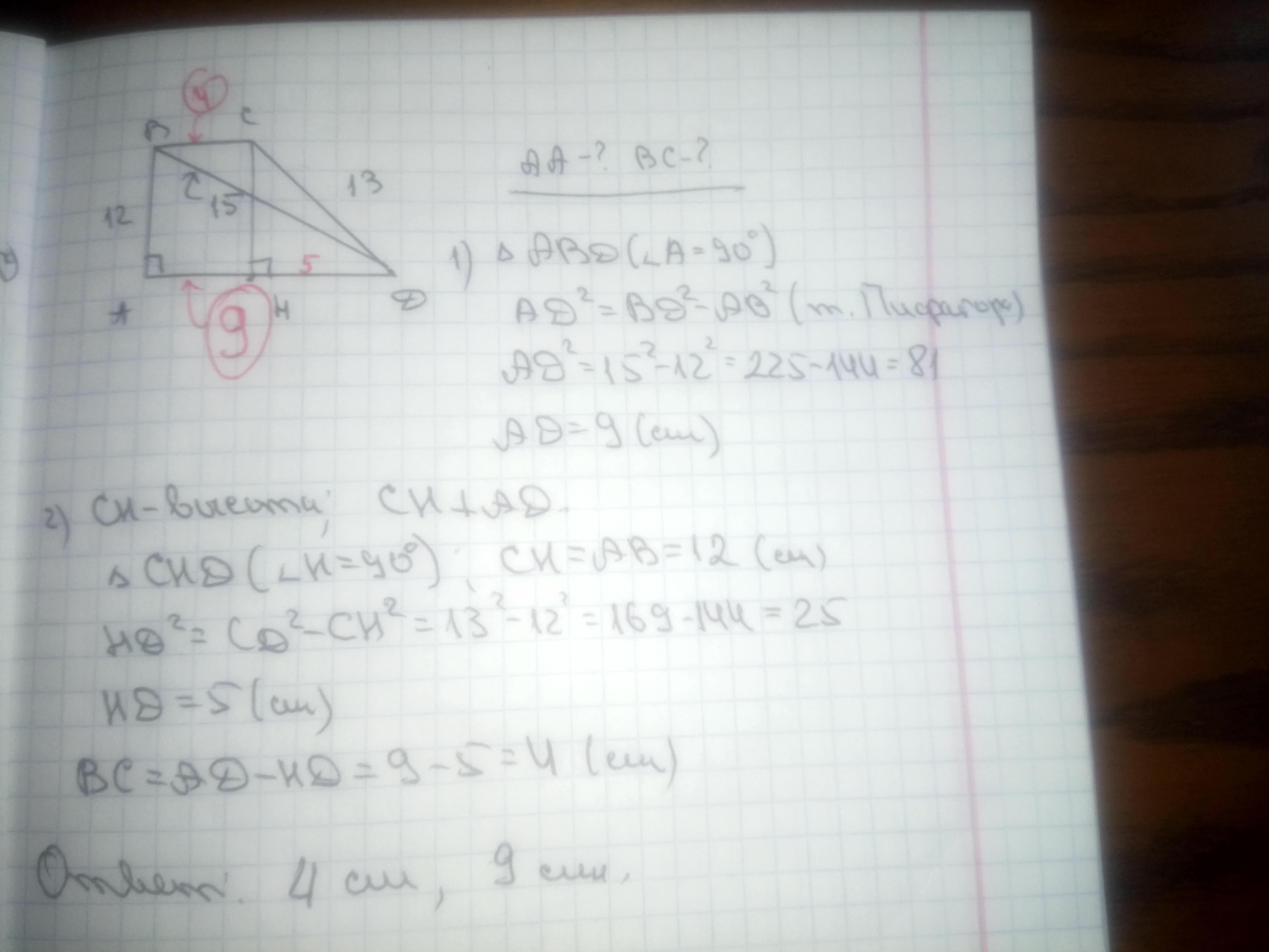 В прямоугольной трапеции Боковые стороны 12 см и 13 см а большая диагональ 15 см Найдите основание трапеции