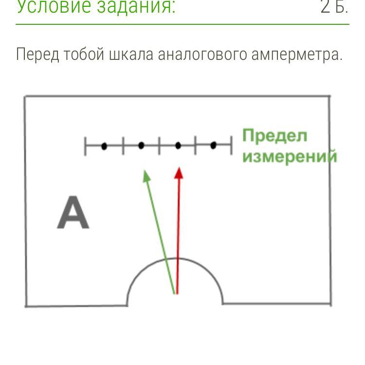 Какая сила тока соответствует показанию зелёной стрелки амперметра, если предел измерений равен 88 А?
