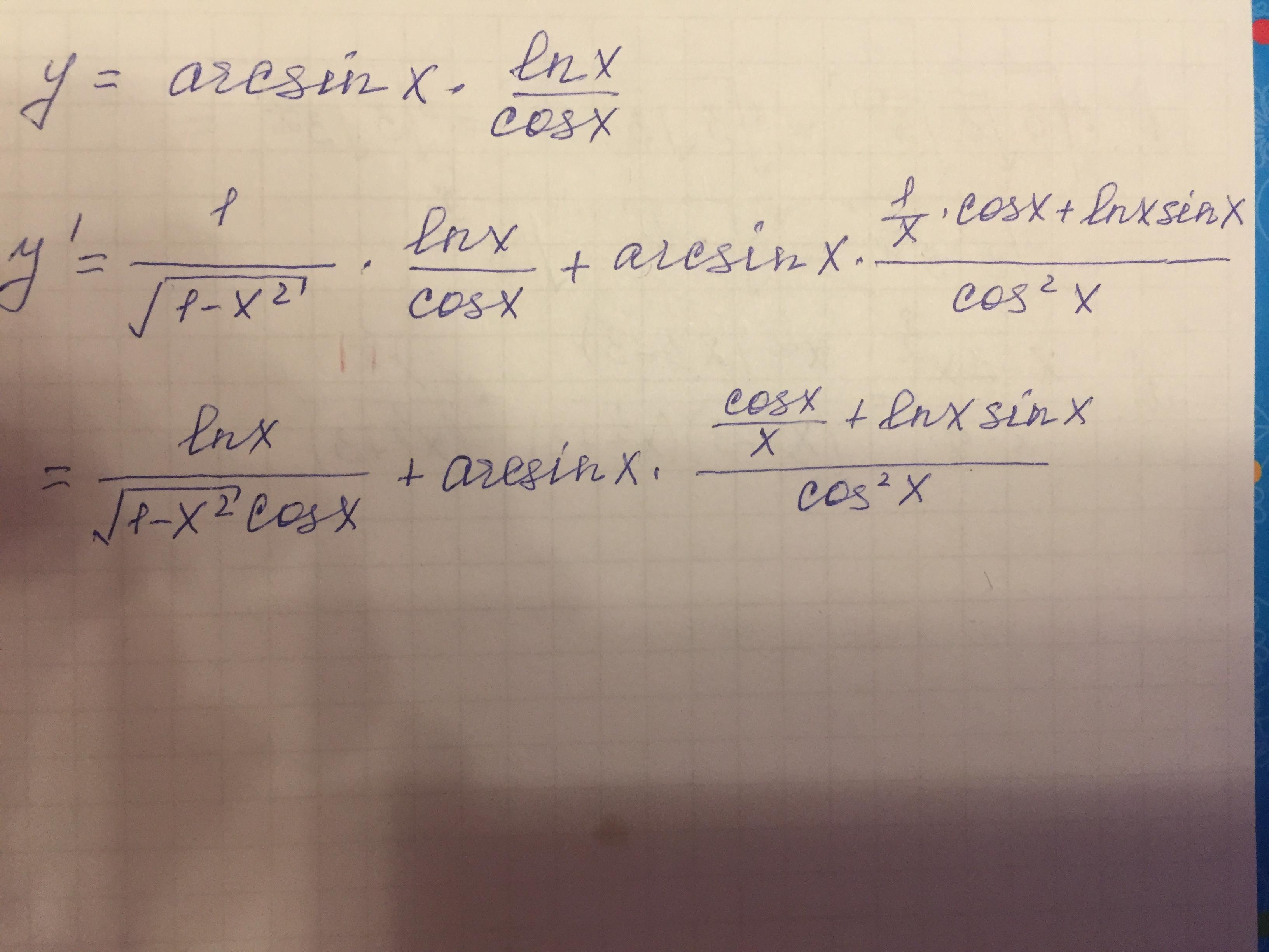 Найдите производную от функции у=аrcsinx*lnx/cosx