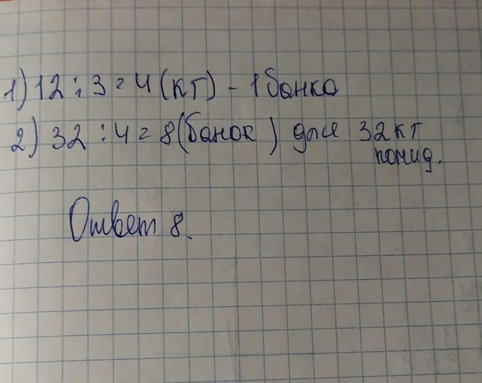 Разложили для засолки 12 кг помидоров в 3 банки.Сколько нужно таких банок,чтобы засолить 32 кг помидоров?Шапочку к задаче и решения.
