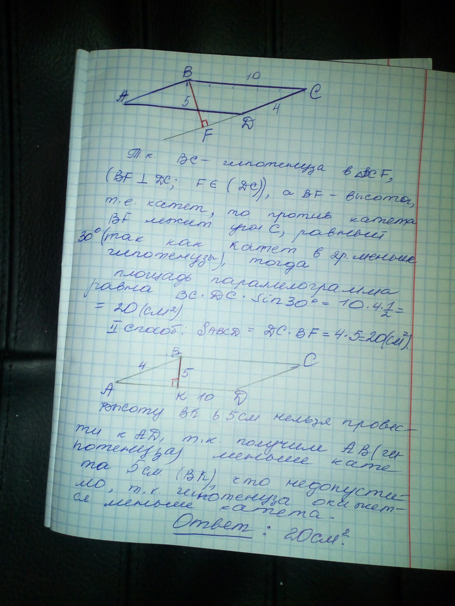 найдите площадь паралелограмма стороны которого равны 10 см и 4 см а одна из высот равна 5 см