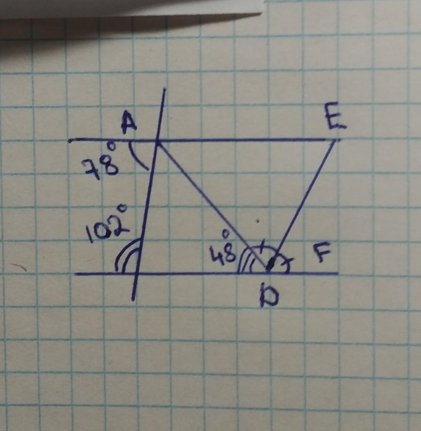 На рисунке DE- биссектриса угла ADF. По данным рисунка найдите углы треугольника
