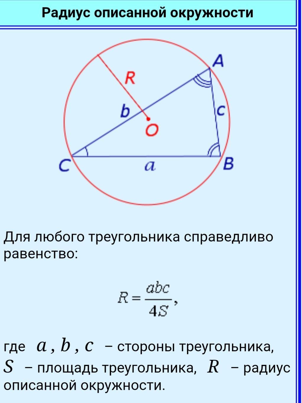 2. Формула нахождения радиуса описанной около треугольника окружности.
