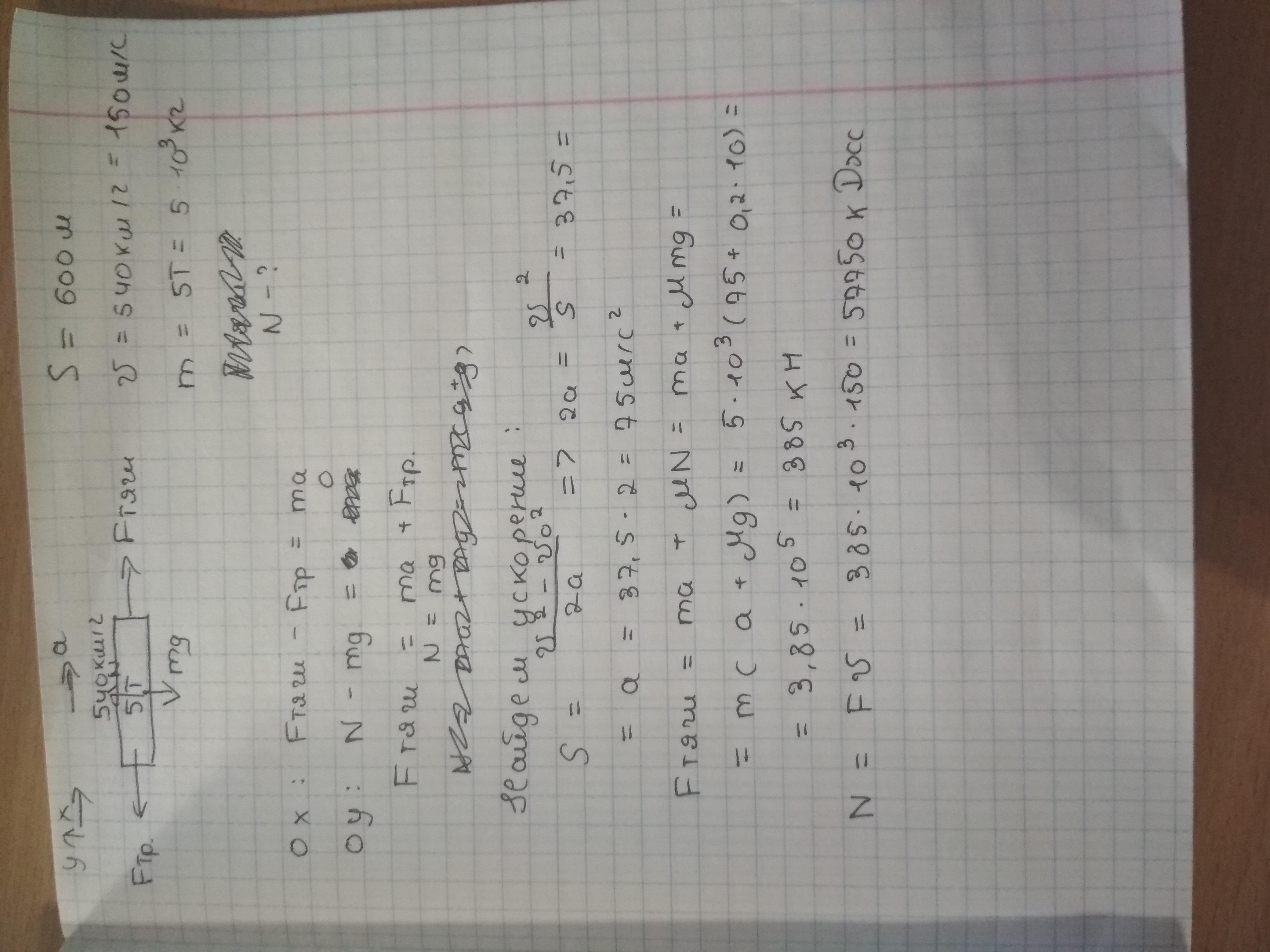 Cамолет массой 5 т для взлета должен иметь скорость 540 км/ч и длину разбега 600 м Какой должна быть мощность двигателя самолета Считать что во время разгона самолет двигался равноускоренно а коэффициент сопротивления был равен 0,2.