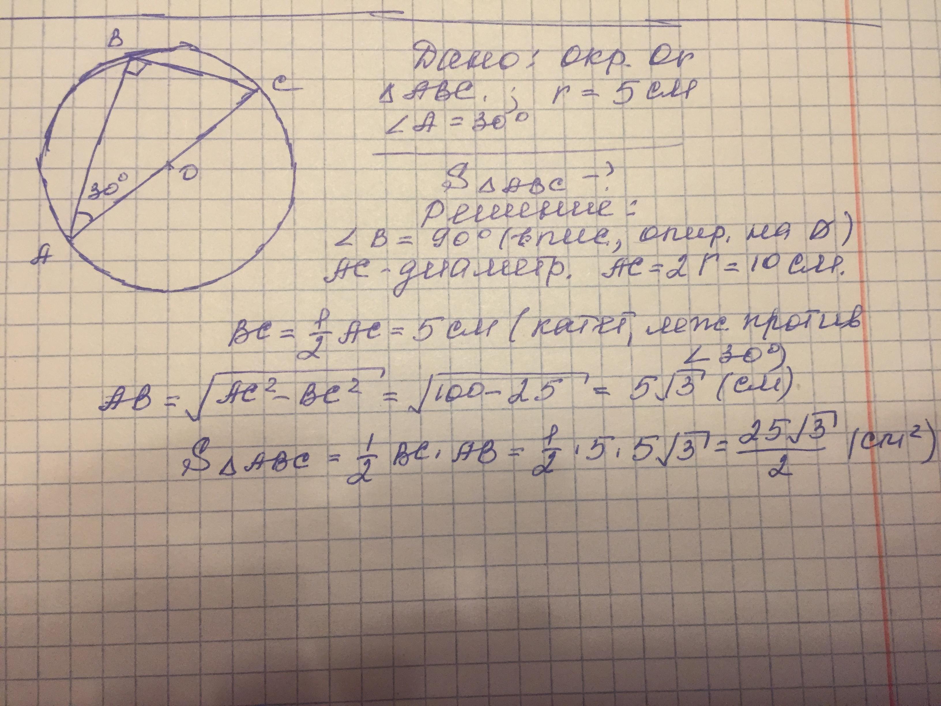 Рассчитайте площадь треугольника, когда радиус круга равен 5,0 см.