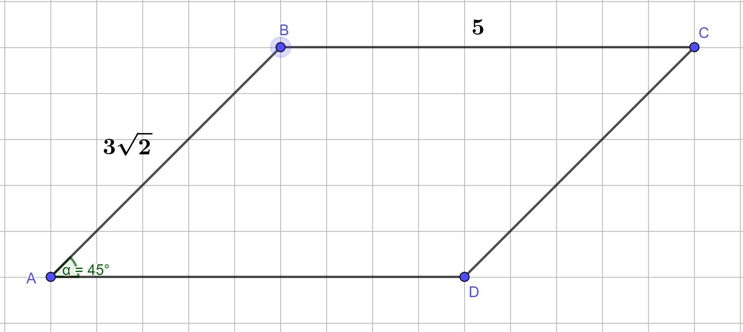 1. Прежде заметим, что AB = CD = 3√2; AD = BC = 5; (рисунок) ∠A = ∠C = 45°; ∠B = ∠D = 180° - 45° = 135° (Свойства параллелограмма)