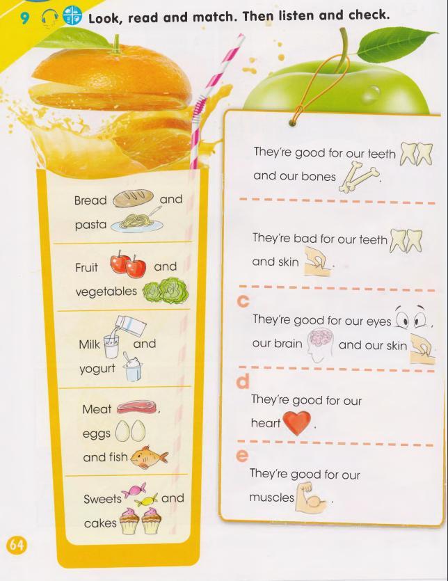 Bread&Pasta - good fo heart, fruit&vegetables - good for eyes etc., milk&yogurt - good for teeth&bones, meat&eggs&fish - good for muscles, sweets&cakes - bad for teeth&skin