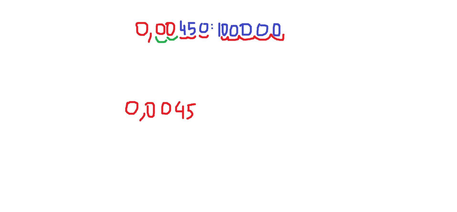 Пошаговое объяснение: что бы обыкновенную дробь превратить в десятичную надо на пять цифр перенести в перёд получаем 0.0045 задние ноли не считаем.