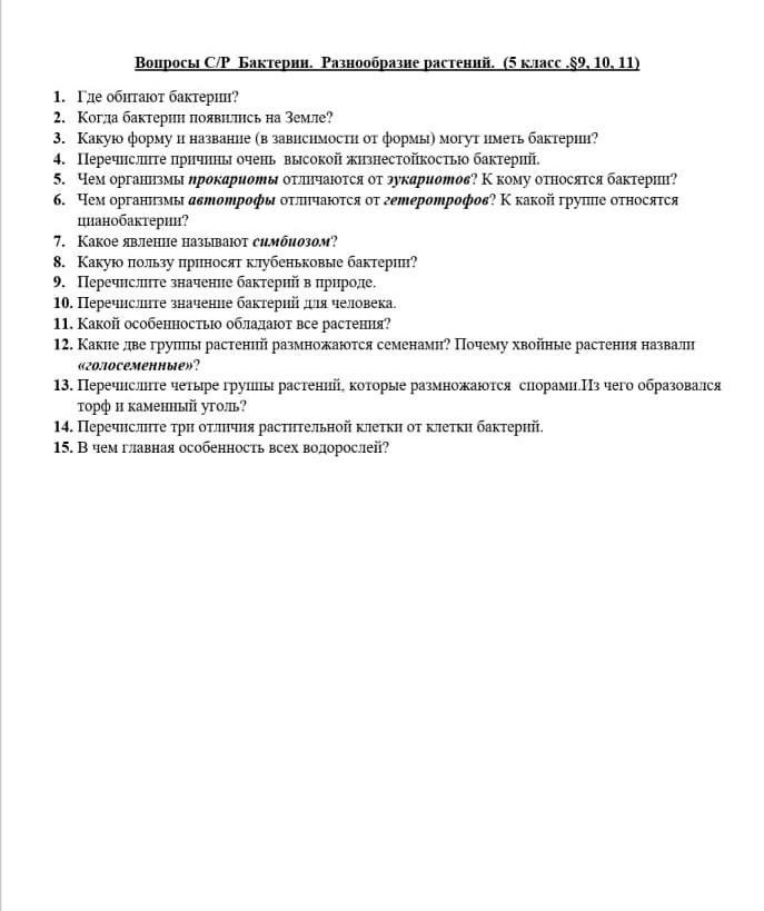 Ответ:1)в почве, в живых организмах, водоемах, везде! 3)3,5млрд.лет назад, 3)кокки-круглые,бациллы-палочковидные,вибрионы в виде запятой, спириллы как спираль. 4)способны образовать споры, 5)прокариоты не имеют ядра, а эукариоты имеют. Бактерии -это прокариоты. 6)автотрофы синтезируют органические вещества из неорганических. Гетеротрофы полгощают готовые органические. Цианобактерии-это автотрофы. 7) Симбиоз это взаимовыгодное сожительство разных организмов. 8)они фиксируют атмосферный азот и переводят его в форму, которую могут усвоить растения, т. е. насыщают почву азотом. Они образуют симбиоз с бобовыми растениями 9)разлагают мёртвую органику, обеспечивая круговорот веществ, вызывают болезни и гибель организмов, сдерживая их численность, продуцируют кислород (Цианобактерии) 10) используют в производстве молочнокислых продуктов, производстве уксуса, натуральных витаминов. Используют в металлургии для отделения металлов от руд. 11) фотосинтезом- созданием органики из углекислого газа и воды на свету. 12) Голосеменные и покрытосеменные. Хвойные не образуют плода, покрывающего и защищающего семена. У хвойных зрелые смена лежат открыто на чешуйках шишек. 13)Моховидные,плауновидные, хвощевидные, папоротниковидные. Торф из мха сфагнума, каменный уголь из древних папоротников и др. споровых. 14) наличие ядра, вакуолей, мембранных органоидов, целлюлозной оболочки. 15) они не имеют тканей и органов. Их тело представлено талломом (слоевищем)