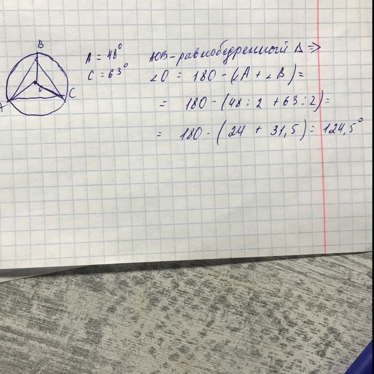 Вокруг треугольника ABC описано окружность с центром О. Найдите углы AOB, BOC и AOC, если: 1) угол A = 48, угол C = 63; 2) угол A = 37, угол C = 44.