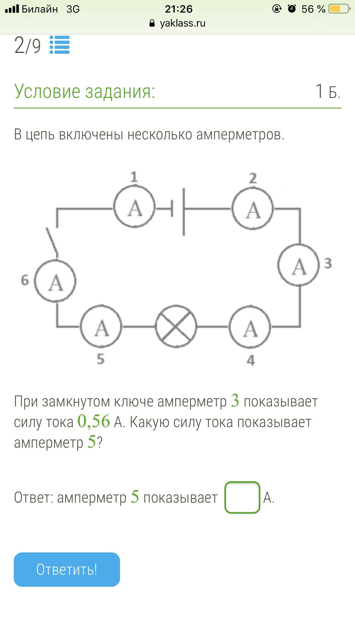 При замкнутом ключе амперметр 3 показывает силу тока 0,56 А. Какую силу тока показывает амперметр 5?