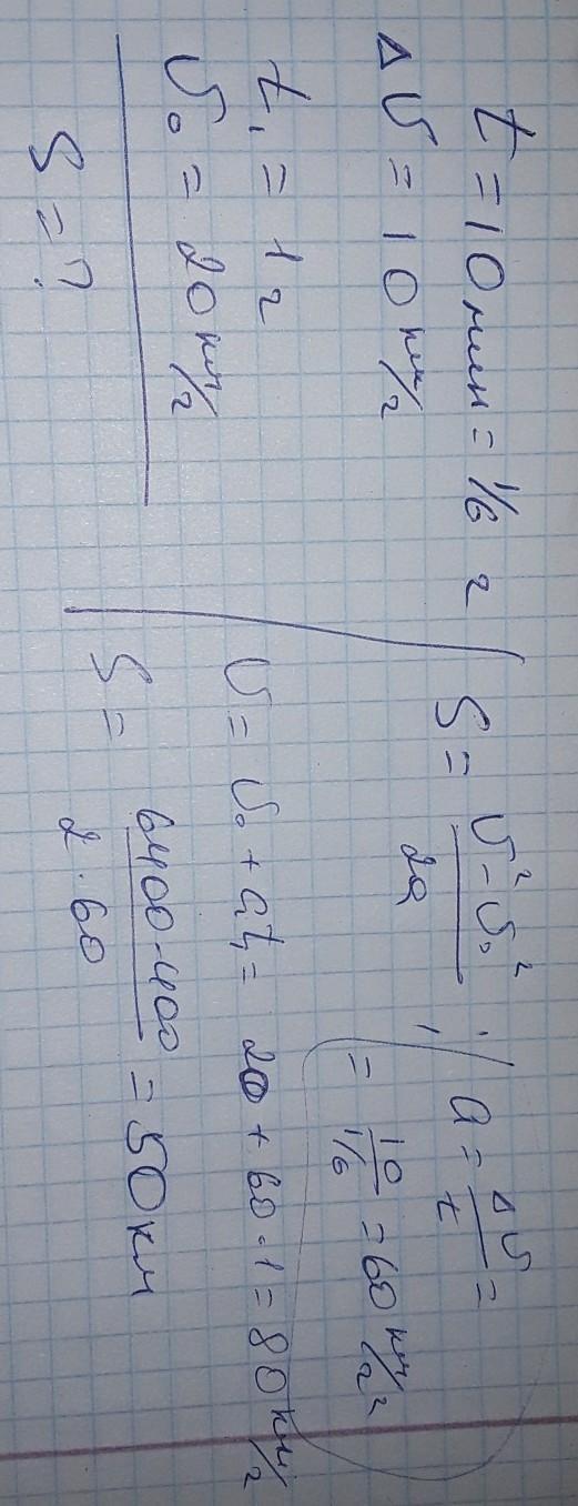 мотоциклист движется равномерно,каждые 10 минут увеличивая свою скорость на 10км/ч.Какое расстояние он преодолеет за 1 час,если начал своё двидение со скорости 20 км/ч?