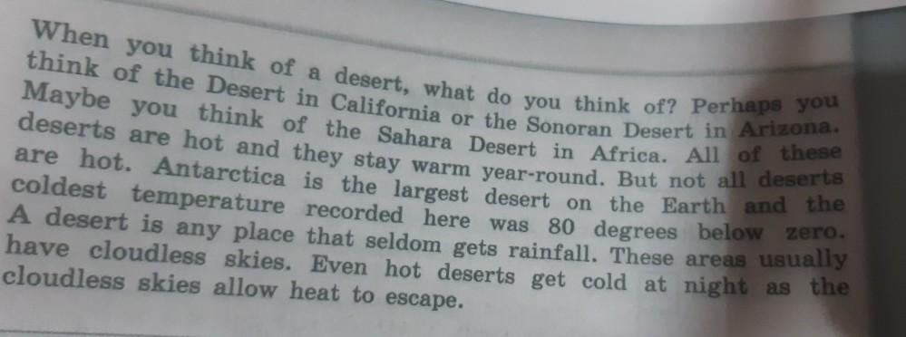 Когда вы думаете о пустыне, о чем вы думаете? Возможно, вы думаете о пустыне в Калифорнии или пустыне Сонора в Аризоне. Может быть, вы думаете о пустыне Сахара в Африке. Все эти пустыни жаркие и остаются теплыми круглый год. Но не во всех пустынях бывает жарко. Антарктида - самая большая пустыня на Земле, и самая холодная температура, зафиксированная здесь, была 80 градусов ниже нуля. Пустыня-это любое место, где редко выпадает дождь. В этих районах обычно безоблачное небо. Даже жаркие пустыни становятся холодными по ночам, поскольку безоблачное небо позволяет теплу уйти.