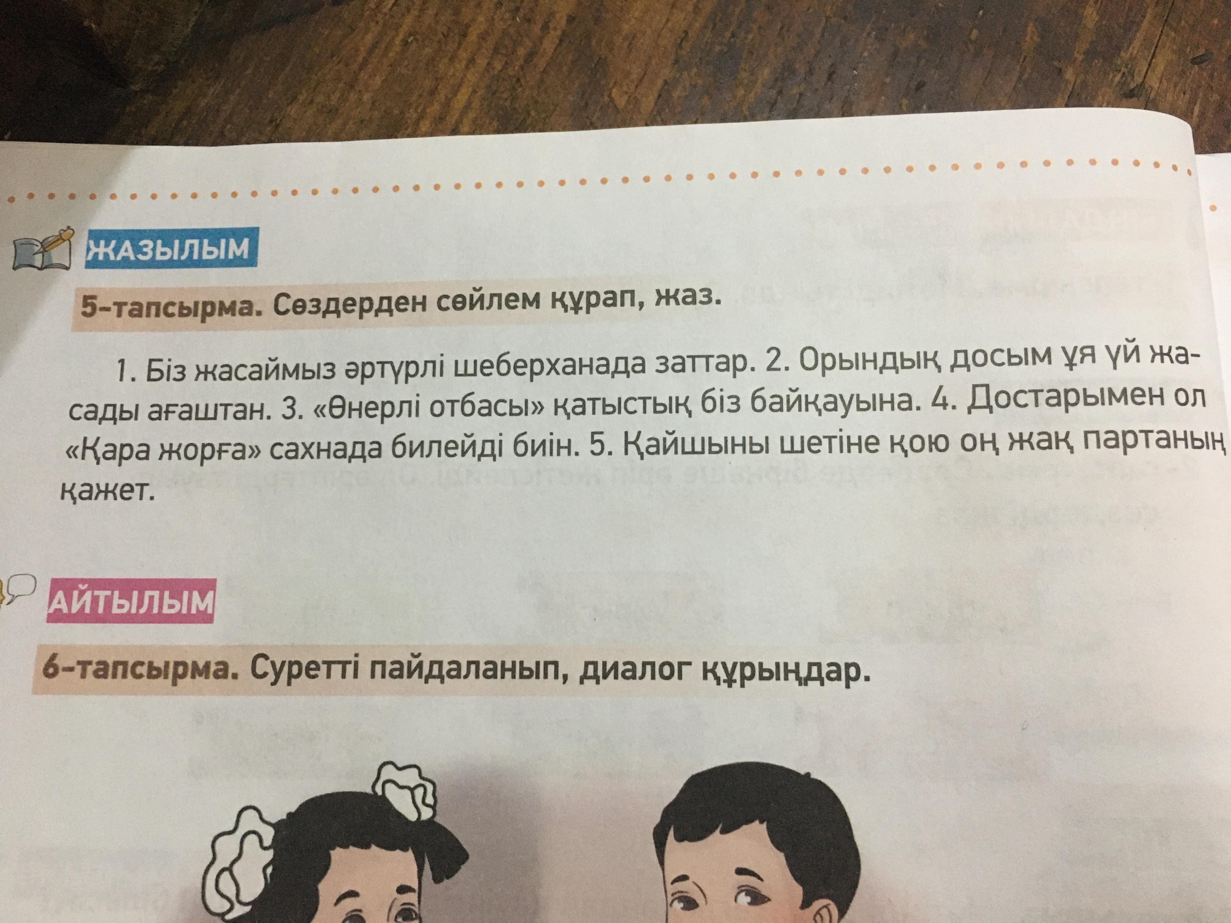 1.Біз шеберханада әртүрлі заттар жасаймыз.3.Біз өнерлі отбасы байқауына қатыстық.4.Ол достарымен сахнада "Қара жорға" биін биледі.5.Қайшыны партаның оң жақ шетіне қою қажет.