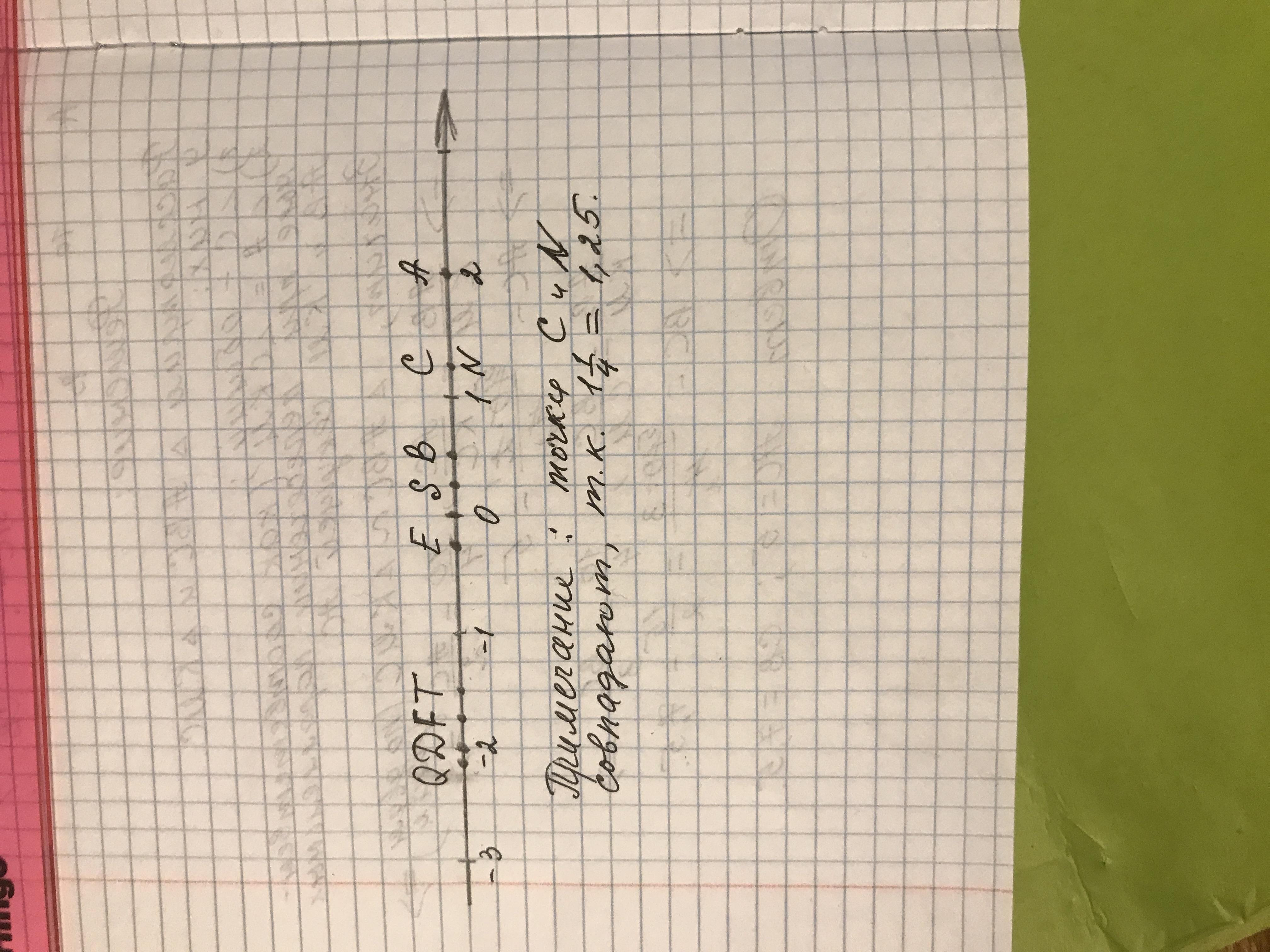 Начертите координатную прямую, взяв за единичный такой отрезок, длина которого в 4 раза больше стороны клетки тетради. Отметьте точки A(2), B (1/2) , C (1 1/4), D(-2), E (-1/4),F(-1.75), Q (-2 1/8), S (0.25), T (-1.5), N (1.25)