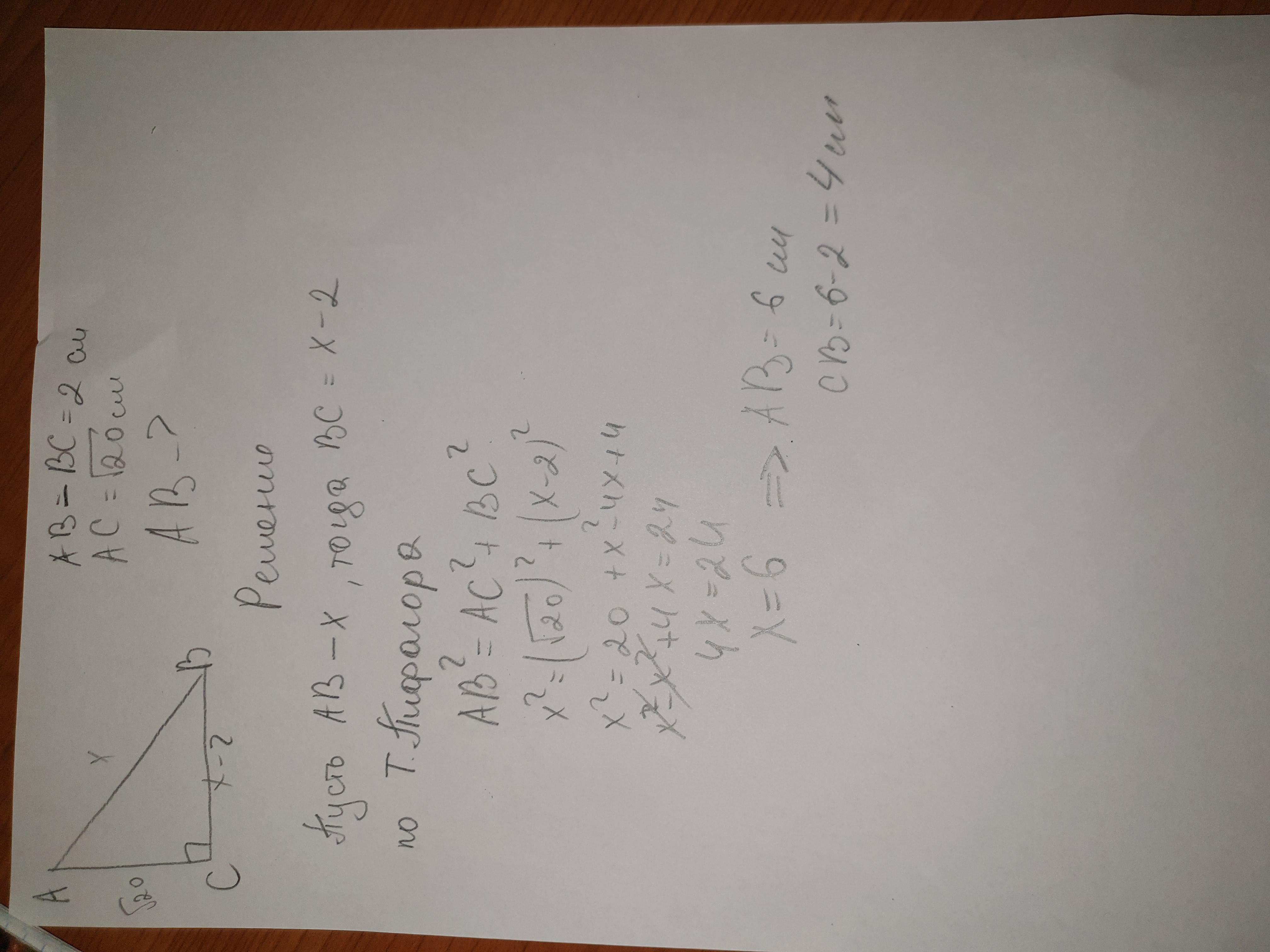 В треугольнике Abc угол С равен 90°, АС равен корень из 20см, а АВ-ВС равно 2см,найдите гипотенузу АВ