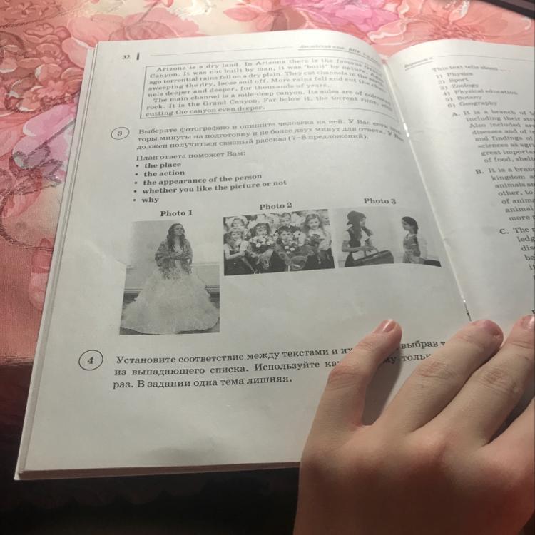 I'd like to describe picture number one. In the picture we can see a girl. She is standing on the stage. She's wearing a beautiful floor-lenth white dress. On her shoulders she has a capote. The girl has got a pretty face and shoulder-length dark hair. I think that she's playing the main role in the performance. I like this picture because the girl looks talented and she's got a really wonderful dress.