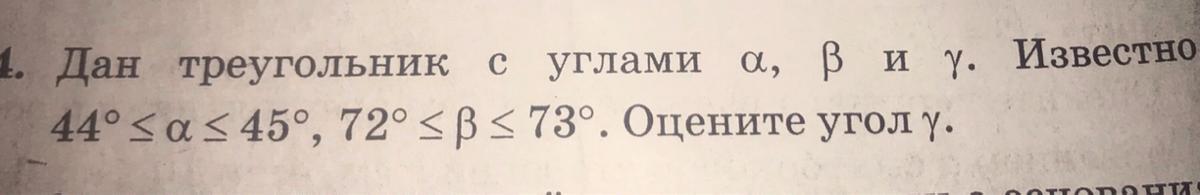 Дан треугольник с углами а,б и у. Известно, что 44°<или равно а<или равно 45°, 72°<или равно б<или равно 73° . Оцените угол у.