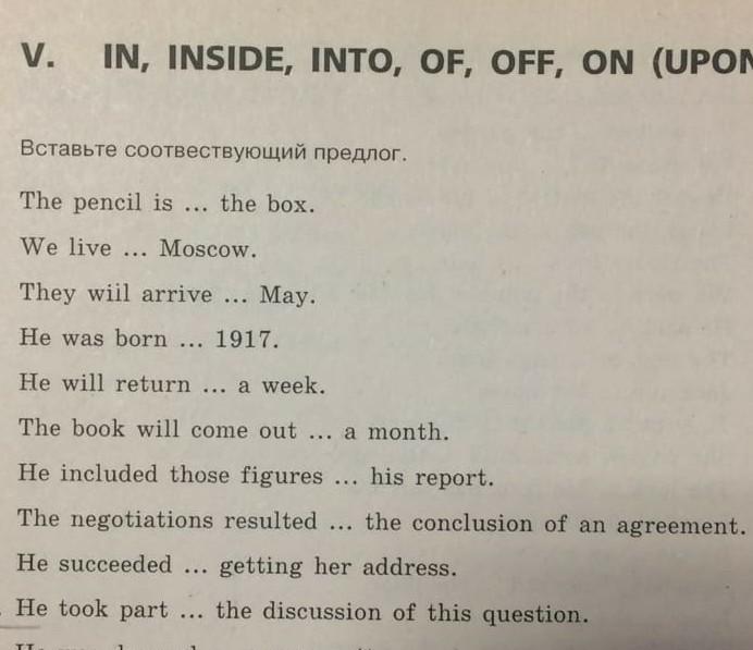 The pencil is in the box. We live in Moscow. They will arrive in May. He was born in 1917. He will return in a week. The book will come out next a month. He included those figures in his report