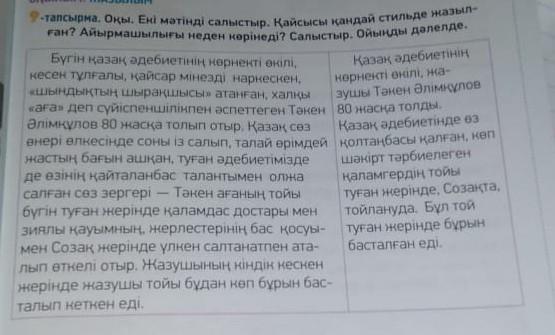 1-ші мәтін ғылыми-танымдық мәтін.2-ші мәтін көркемдік мәтін.Ұқсастығы екі мәтінде жазушы Тәкен Әлімқұлов туралы.Айырмашылығы мәтіннің стилінде.1-ші мәтін ғылыми тұрғыда,әдеби тілмен жазылған.Екінші мәтін қарапайым тілде,әңгіме ретінде жазылған.