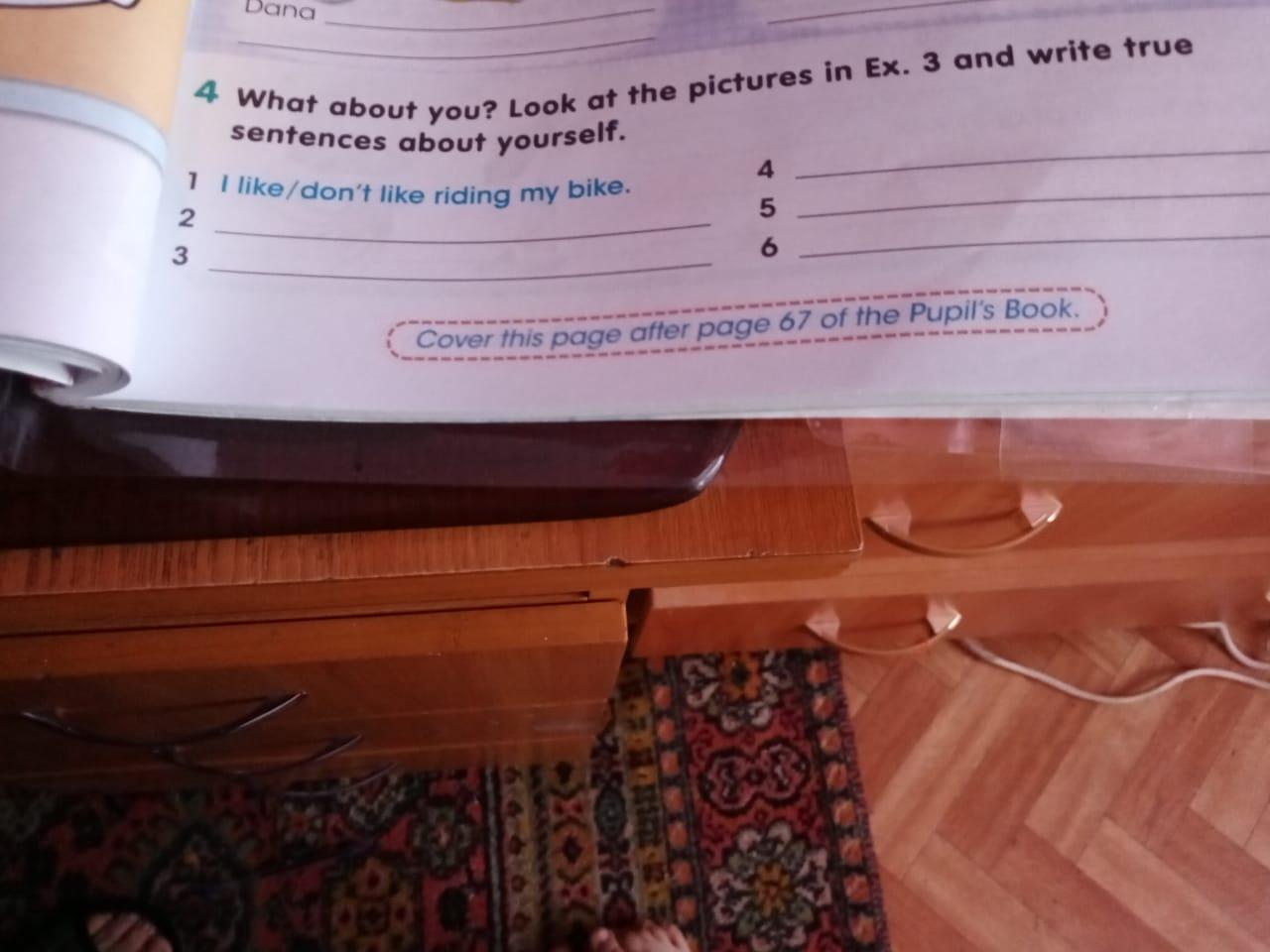 1) I like riding my bike.2) I don't like cleaning.3) I don't like planting flowers.4) I like painting.