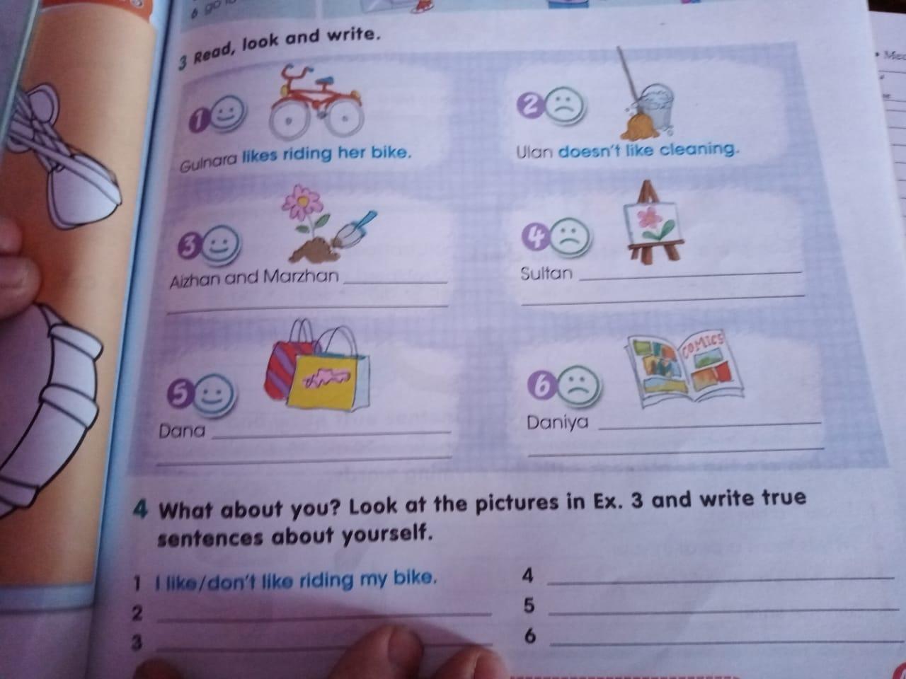 1) I like riding my bike.2) I don't like cleaning.3) I don't like planting flowers.4) I like painting.5) I like going shopping.6) I like reading comics.