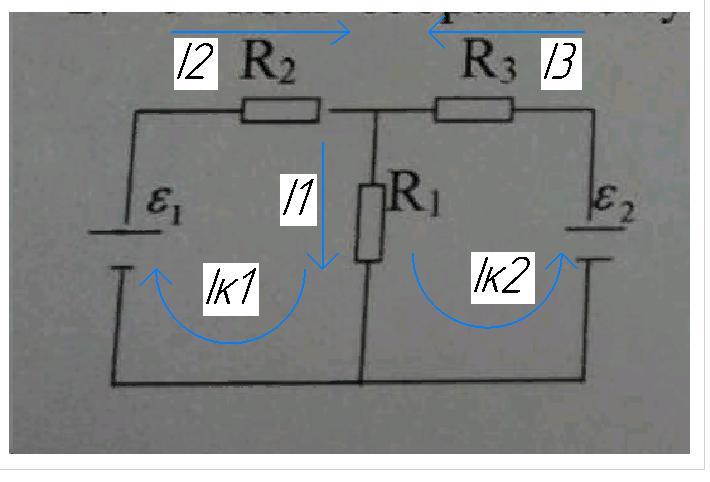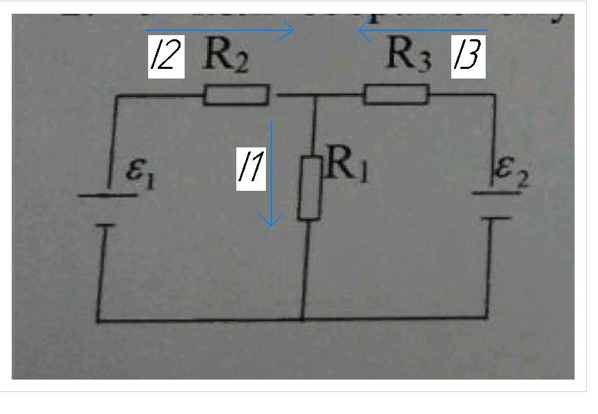 По 1 закону количество уравнений определяется как у-1, где у-количество узлов, в данном случае у нас 2 узла, то есть по 1 закону Кирхгофа необходимо составить 1 уравнение