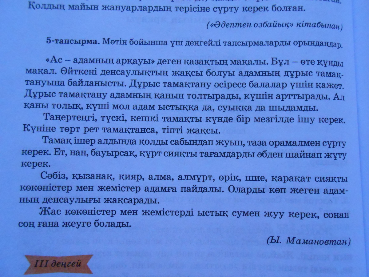 3)Біз неге дҰрыс тамақтануымыз керек?Дұрыс тамақтану адамның қанын толтырады,күшiн арттырады. Ал қаны толық, күшi мол адам ыстыққа да, суыққа да шыдамды,