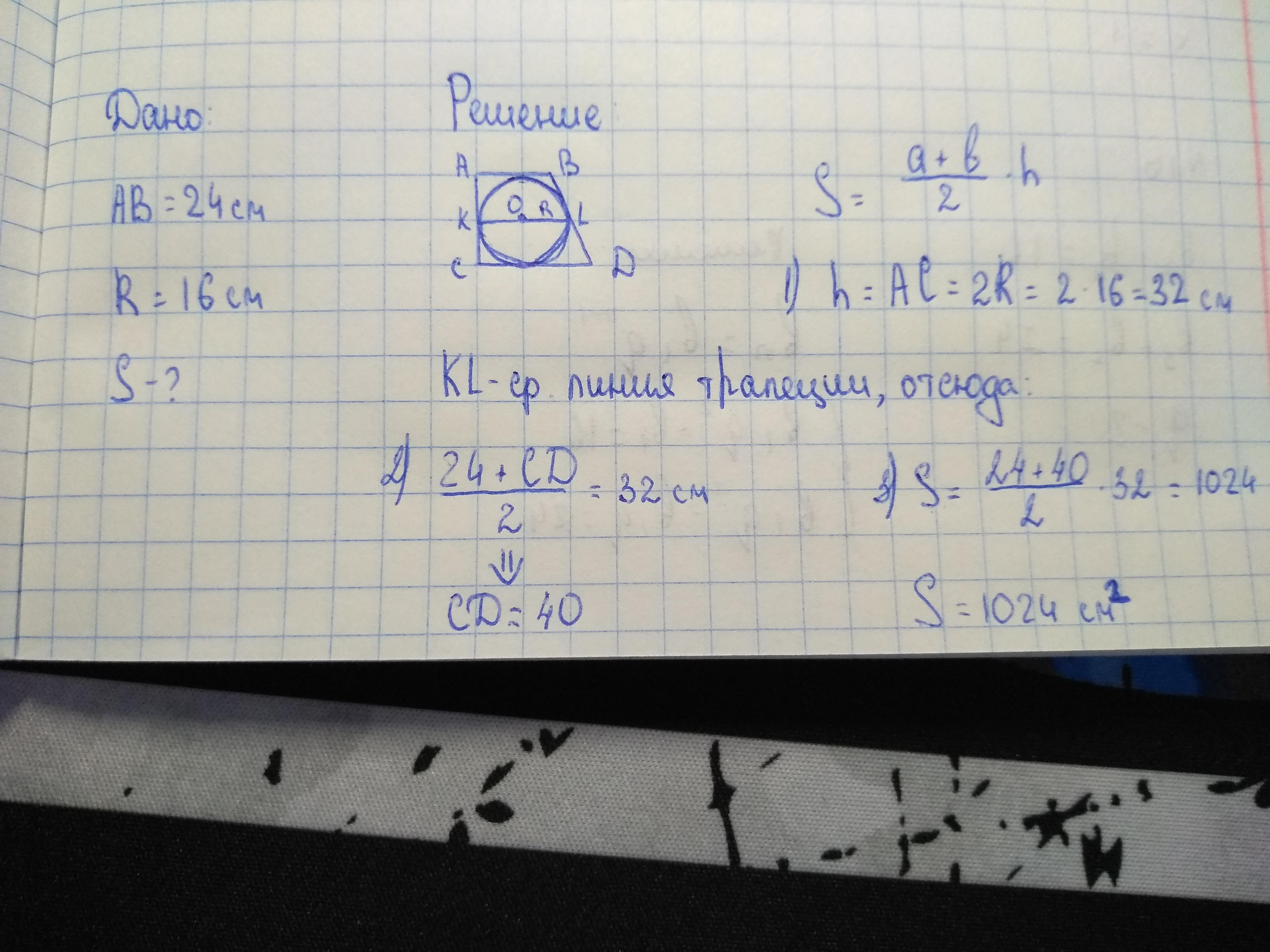 В прямоугольную трапецию вписана окружность, радиус которой равен 16 см. Меньшее основание равно 24 см. Найти площадь трапеции.