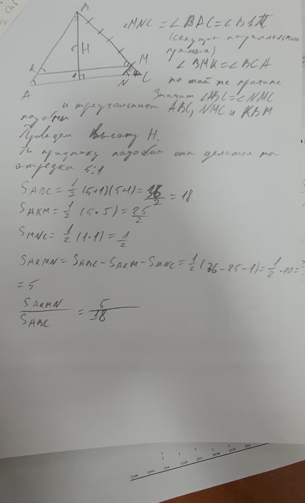 В треугольник АВС вписан параллелограмм АКМN, где точки К, М и N принадлежат сторонам АВ, ВС и АС соответственно, причем ВМ:МС=5:1. Какую часть площади треугольника АВС составляет площадь этого параллелограмма. Заранее, спасибо)