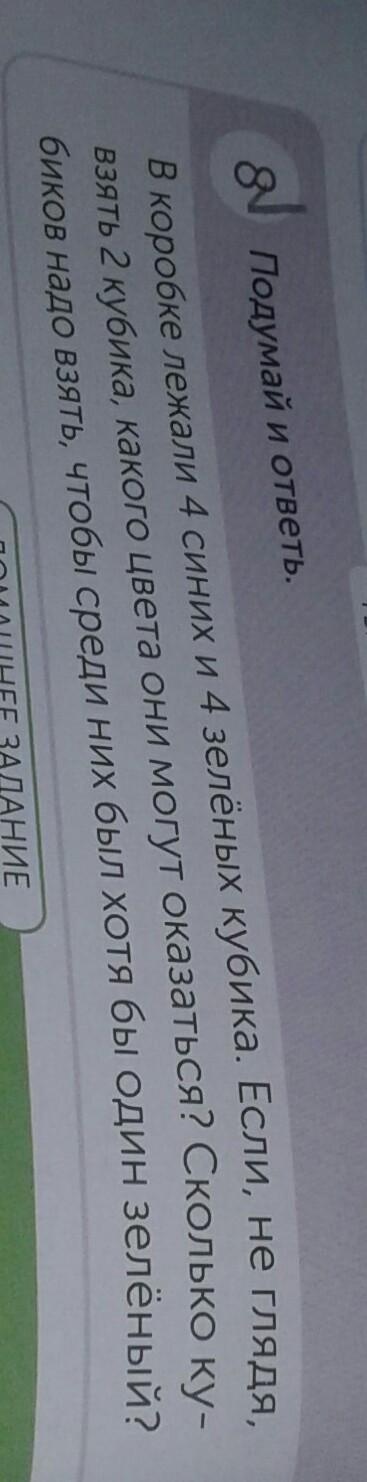 в коробке лежали четыре синих и 4 зелёных кубика если не глядя взять два кубика Какого цвета они могут оказаться сколько кубиков надо взять чтобы среди них было хотя бы один зелёный