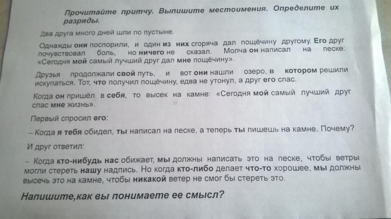 Они(личное), из них(притяжательное), его(притяжательное), ничего(отрицательное) он(личное), мой(притяжательное), мне(притяжательное),свой(притяжательное), они(личное), в котором(относительное), что(вопросительное), он(личное),себя(возвратное), мой(притяжательное), мне(притяжательное), его(притяжательное), я(личное), тебя(притяжательное), ты(личное), кто-нибудь(неопределённое), мы(личное),что-то(неопределённое),никакой(отрицательное)