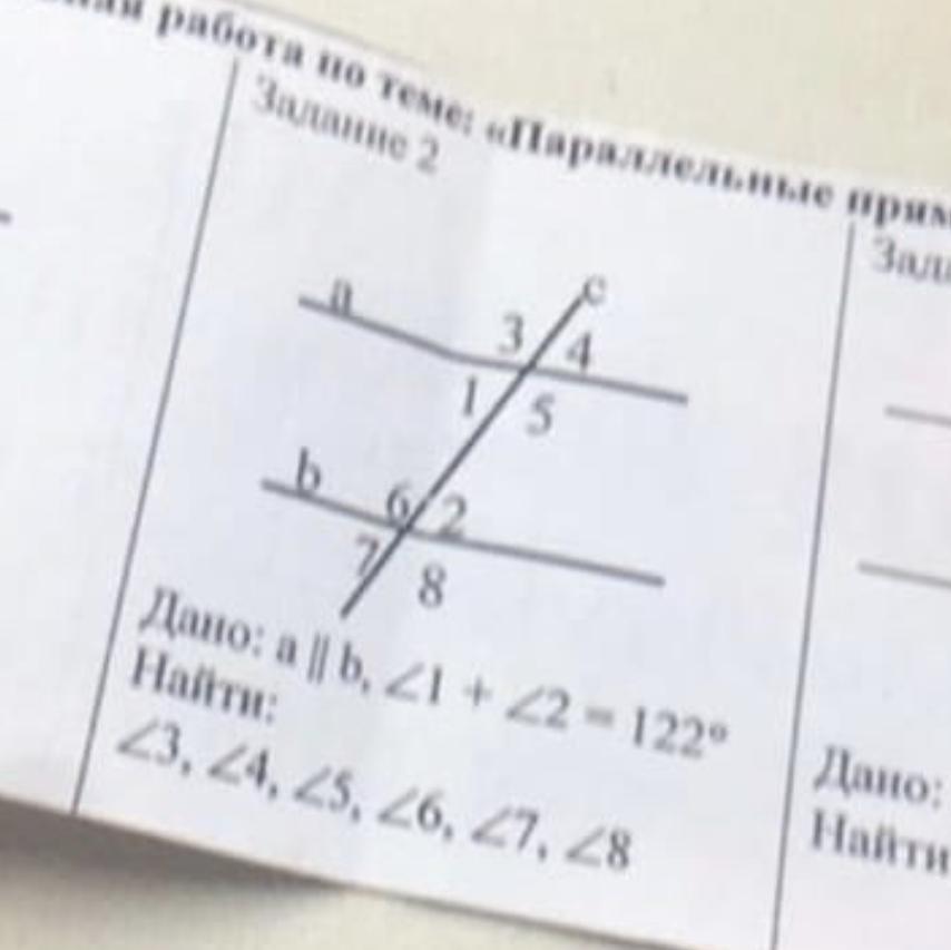 Объяснение:углы 1 и2 накрест лежащие,они равны между собой, каждый равен 122:2=61, углы 1 и 4 равны как вертикальные, значит угол 4 равен 61 , углы 3 +4 в сумме 180 градусов, так как они смежные , значит угол 3 ровен 180-61= 119 гр,уголы 5и3 вертикальные, равны по 61 градусу, углы 6 и3 равны по119 градусов, они соответственные, угол7равен 1 равны 61 градусу, угол 8 равен 5 равны 119 градусов