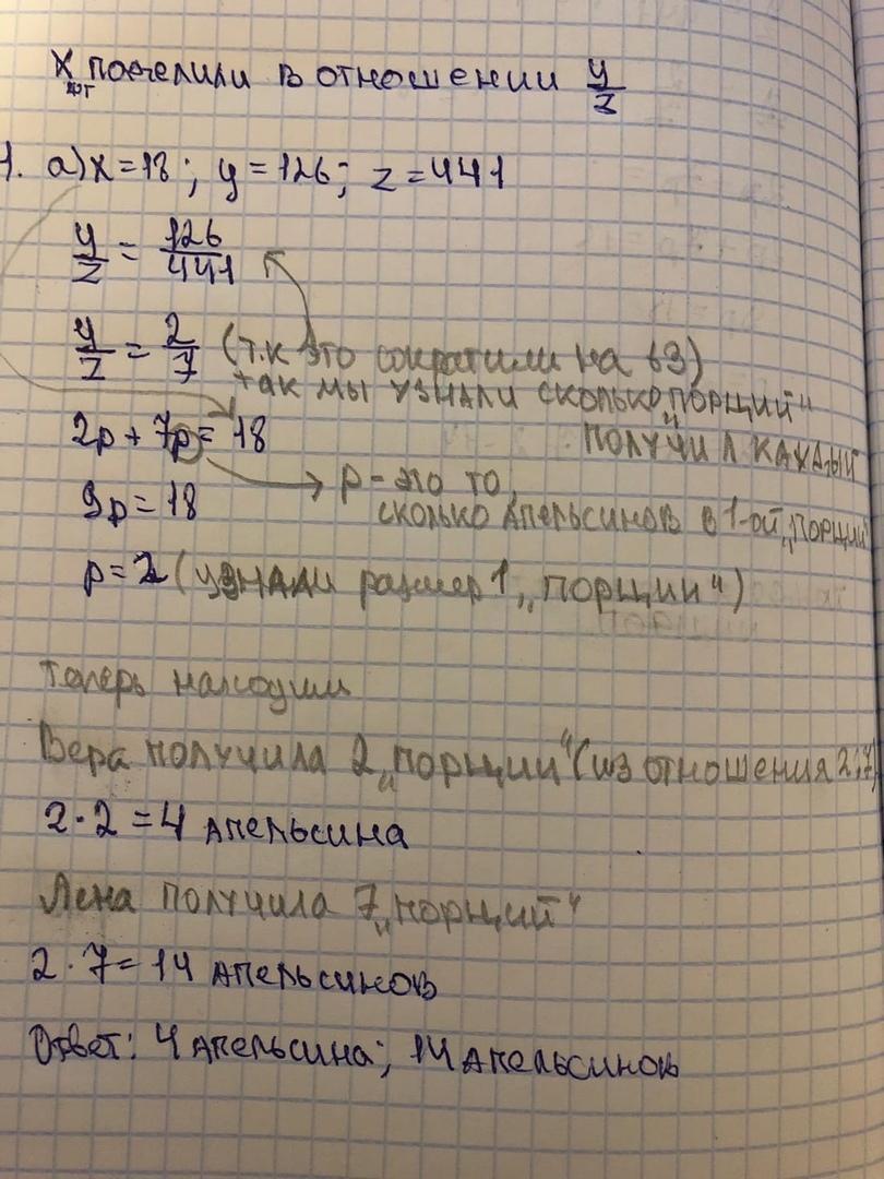 1.Вера и Лена поделили X апельсинов в отношении y:z. Сколько получила каждая из них если a) x=18 ; y=126; z=441; b) x=30; y=209; z=76?
