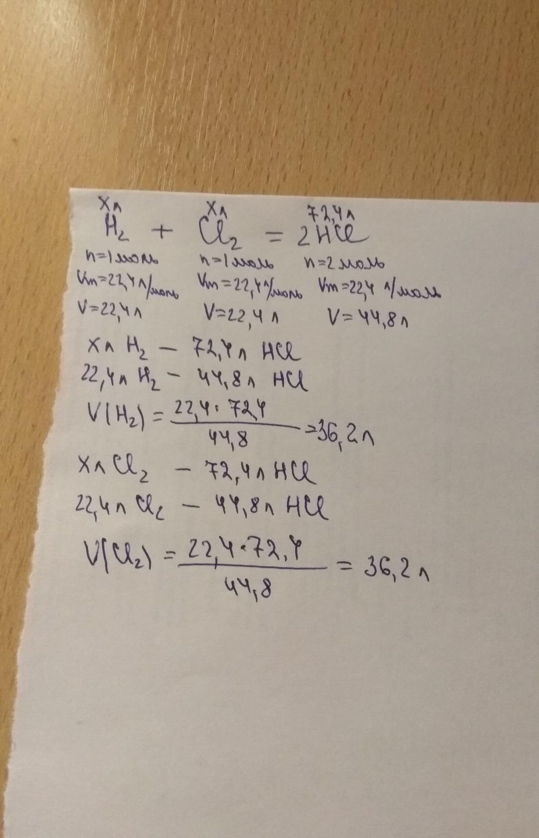 Рассчитайте объемы водорода и хлора, необходимые для получения 72,4 л гидрохлорида.(Ответ должно быть:V (H2) = 36,2 л; V (CI2) = 36,2 л)