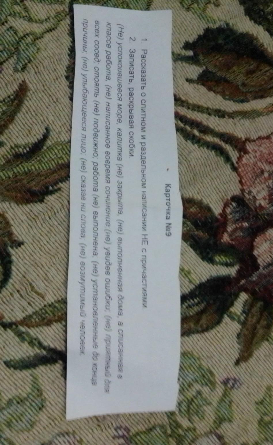 2. Неуспокоившееся море(нет зависимых слов); калитка не закрыта(краткое причастие); не выполненное дома, а списанная в классе работа(противопоставление с союзом а); не написанное вовремя сочинение(есть зависимое слово); не увидев ошибки(деепричастие); неприятный для всех сосед(можно заменить синонимом); стоять неподвижно(можно подобрать синоним); работа не выполнена(краткое причастие); не установленные до конца причины(есть зависимое слово); неулыбающееся лицо(можно подобрать синоним); не сказав ни слова(деепричастие); невозмутимый человек(можно подобрать синоним).