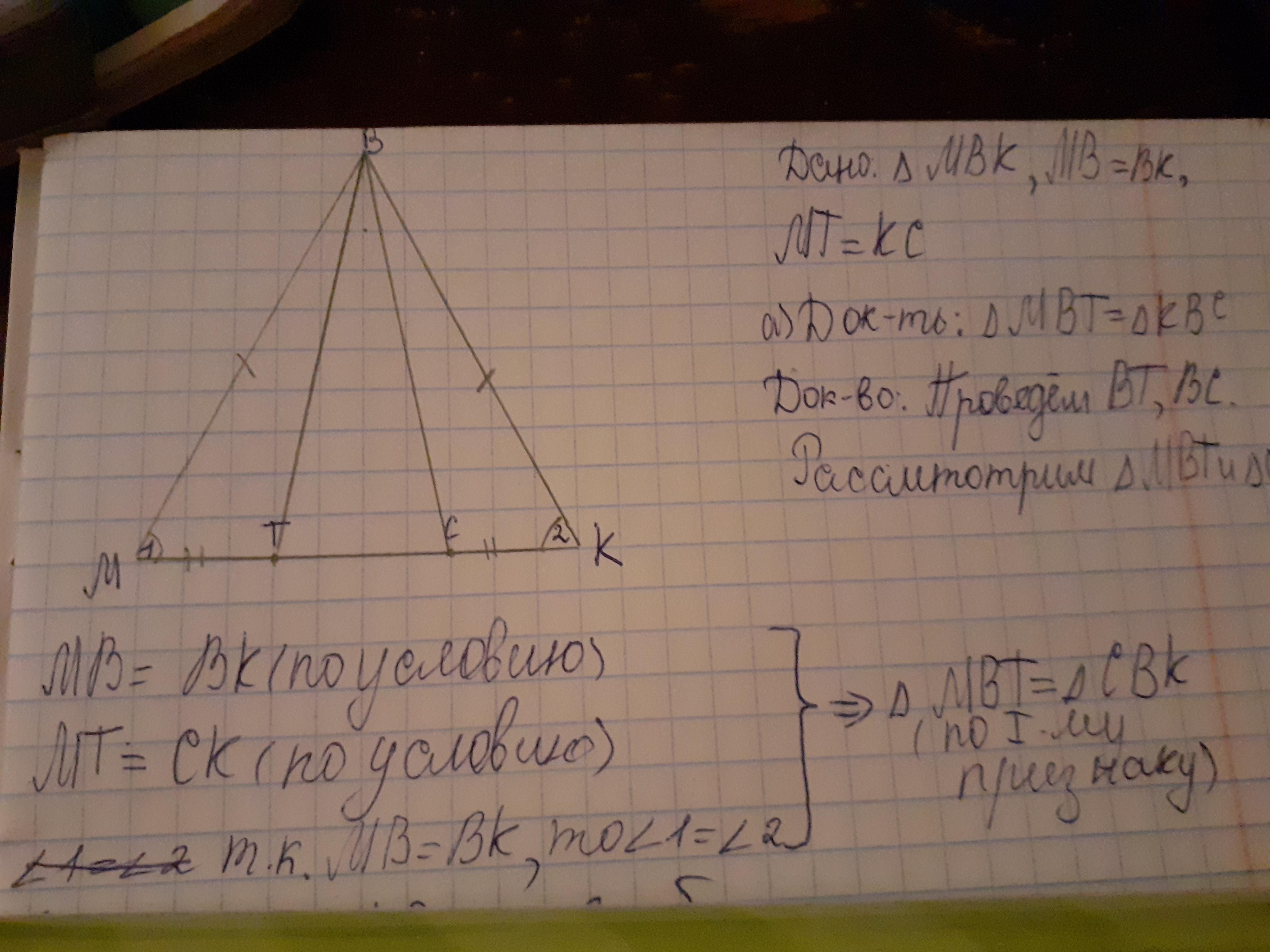 На основании MK равнобедренного труегольника MBK отмечены точки T и C так, что MT = KC. Докажите, что: