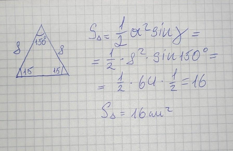 Бічна сторона рівнобедреного трикутника дорівнює 8 см, а кут при основі - 15°. Знайдіть площу трикутника