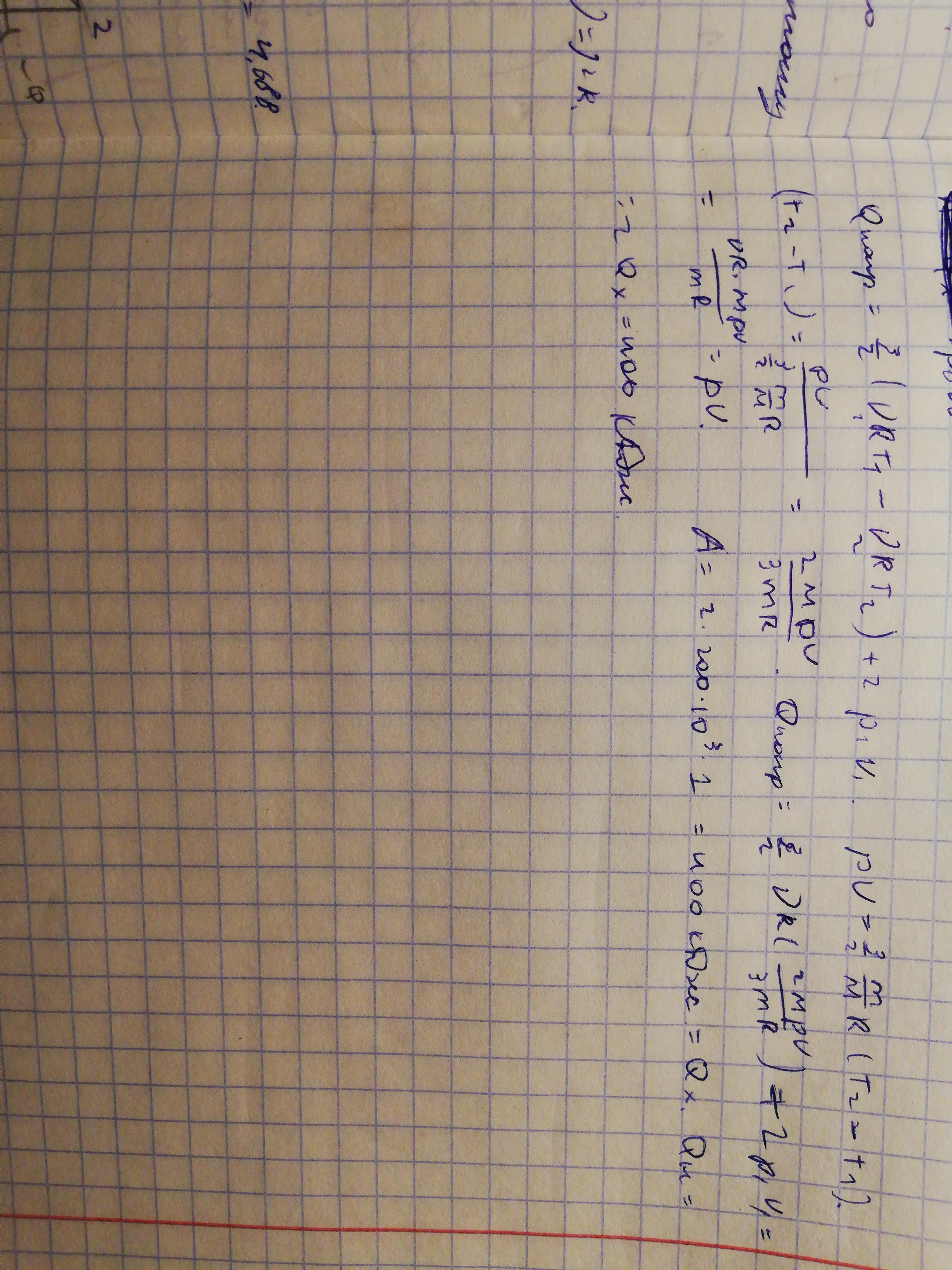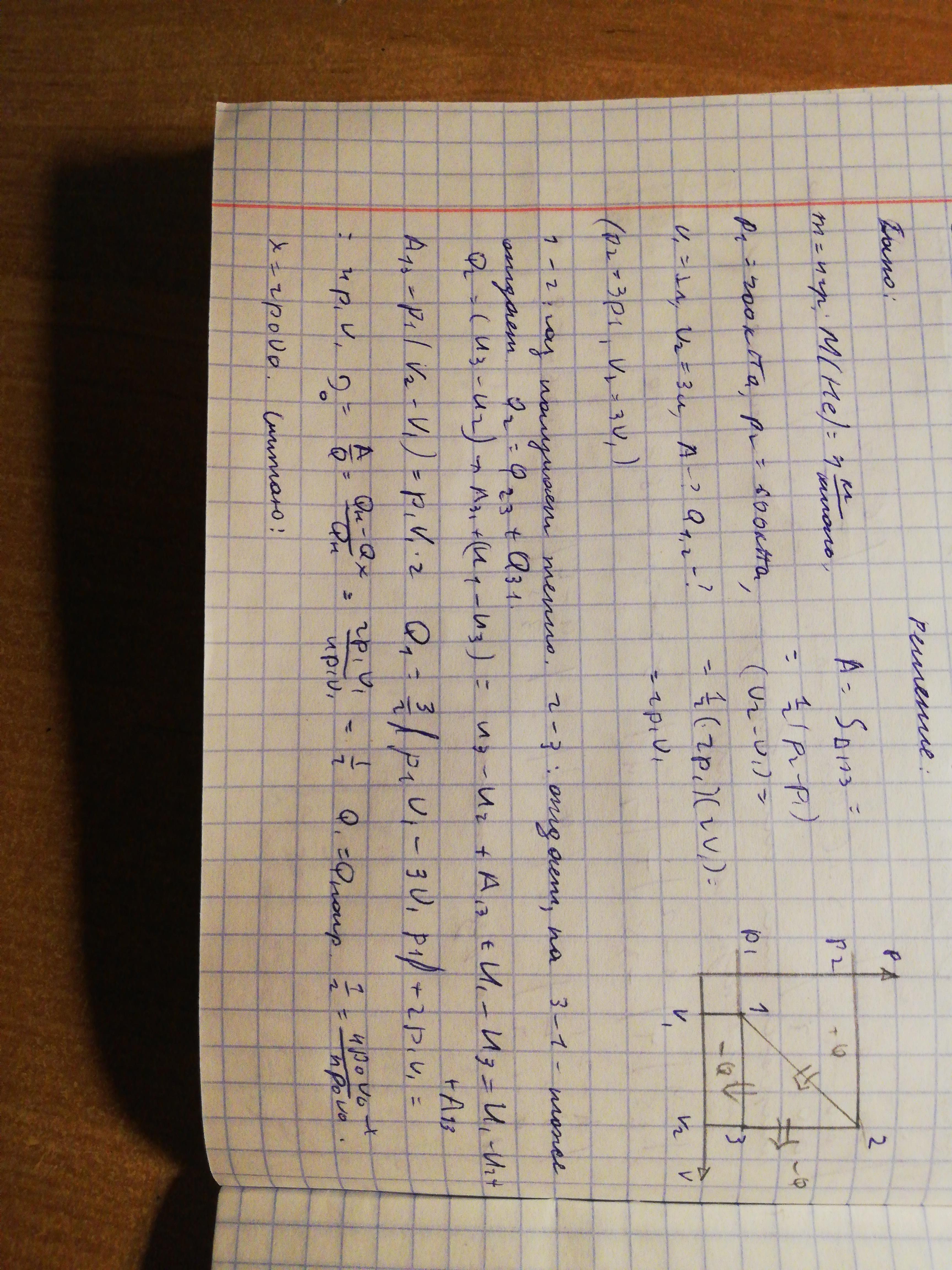 Гелий массой 4г совершает цикл, изображенный на риснке. Определить работу А, совершаемую газом за один цикл, а также кол-во теплоты, полученное от нагревателя Q1 и переданное холодильнику Q2 за цикл, если р1=200кПа, р2=600кПа, V1=1л, v2=3л