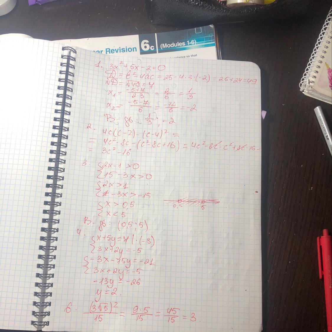 х2=-в-квадратных корень Д/2а= -5+квадр.корень49/2×3=5-7/6=-2/6=1/3