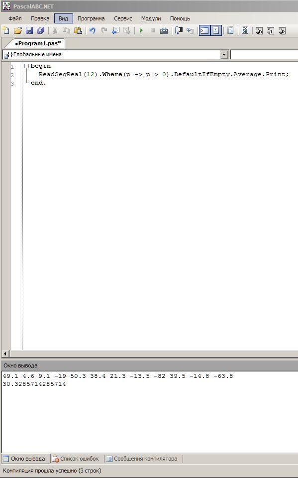 ReadSeqReal(12).Where(p -> p > 0).DefaultIfEmpty.Average.Print;