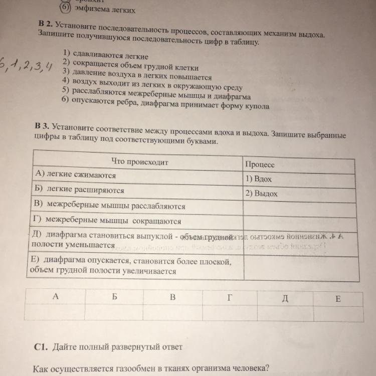 Установите соответствие между процессами вдоха и выдоха. Запишите выбранные цифры под соответствующими буквами. Вопрос В3 на фото. Заранее спасибо за ответ )