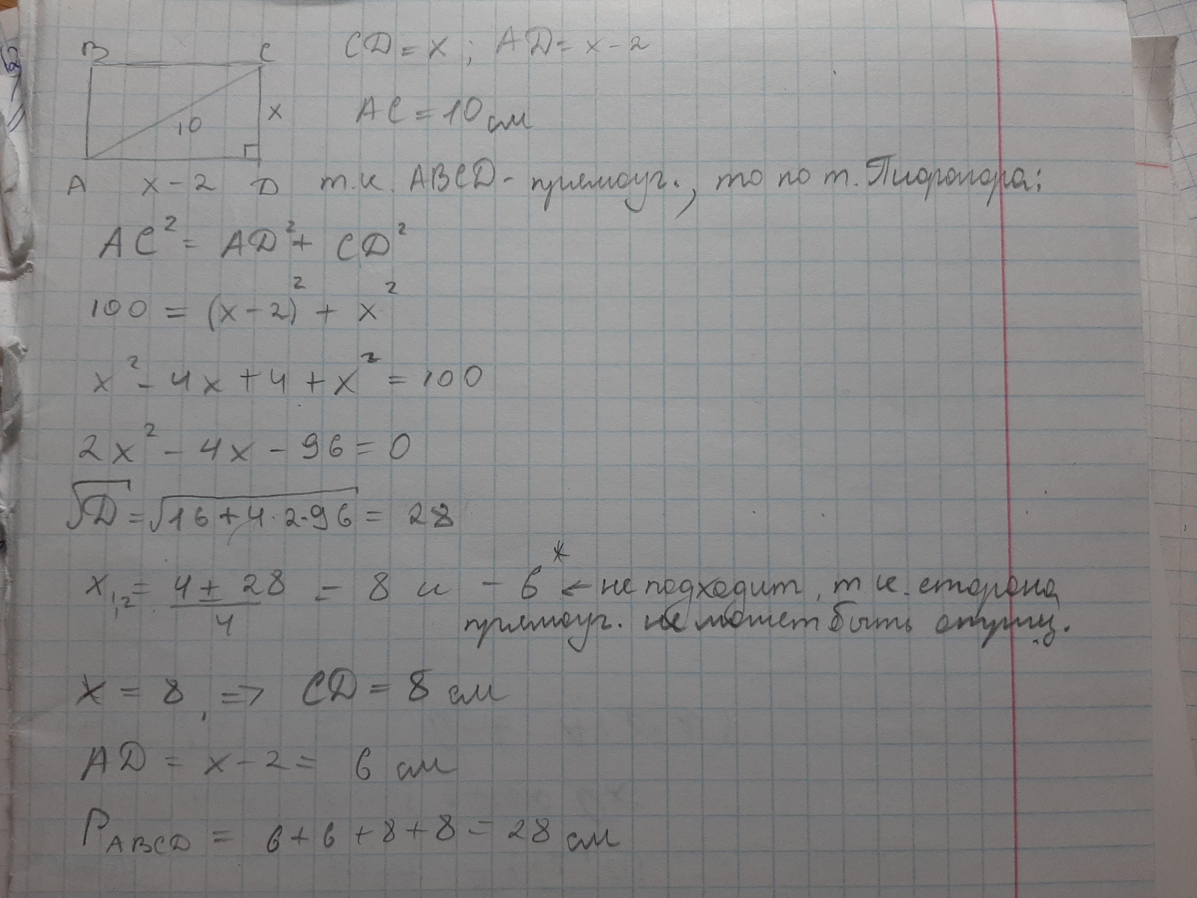 одна из сторон прямоугольника на 2 см меньше чем другой, а его диагональ равна 10 см найдите периметр прямоугольника. пожалуйста с чертежом.