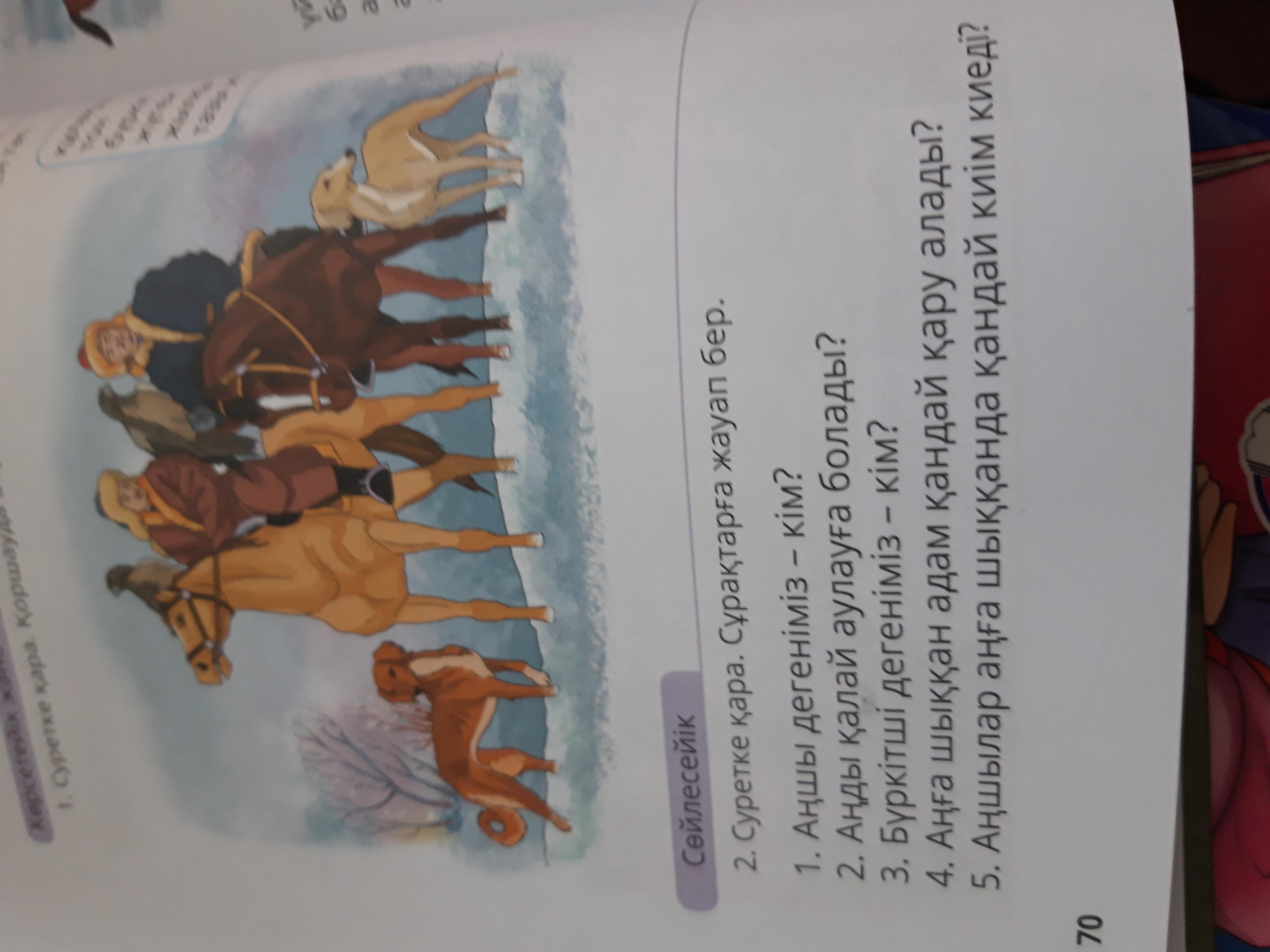 5:Аңшылар аңға шыққанда қалың, жылы киім киеді. Және бастарына тамақ, үстіне тон киеді