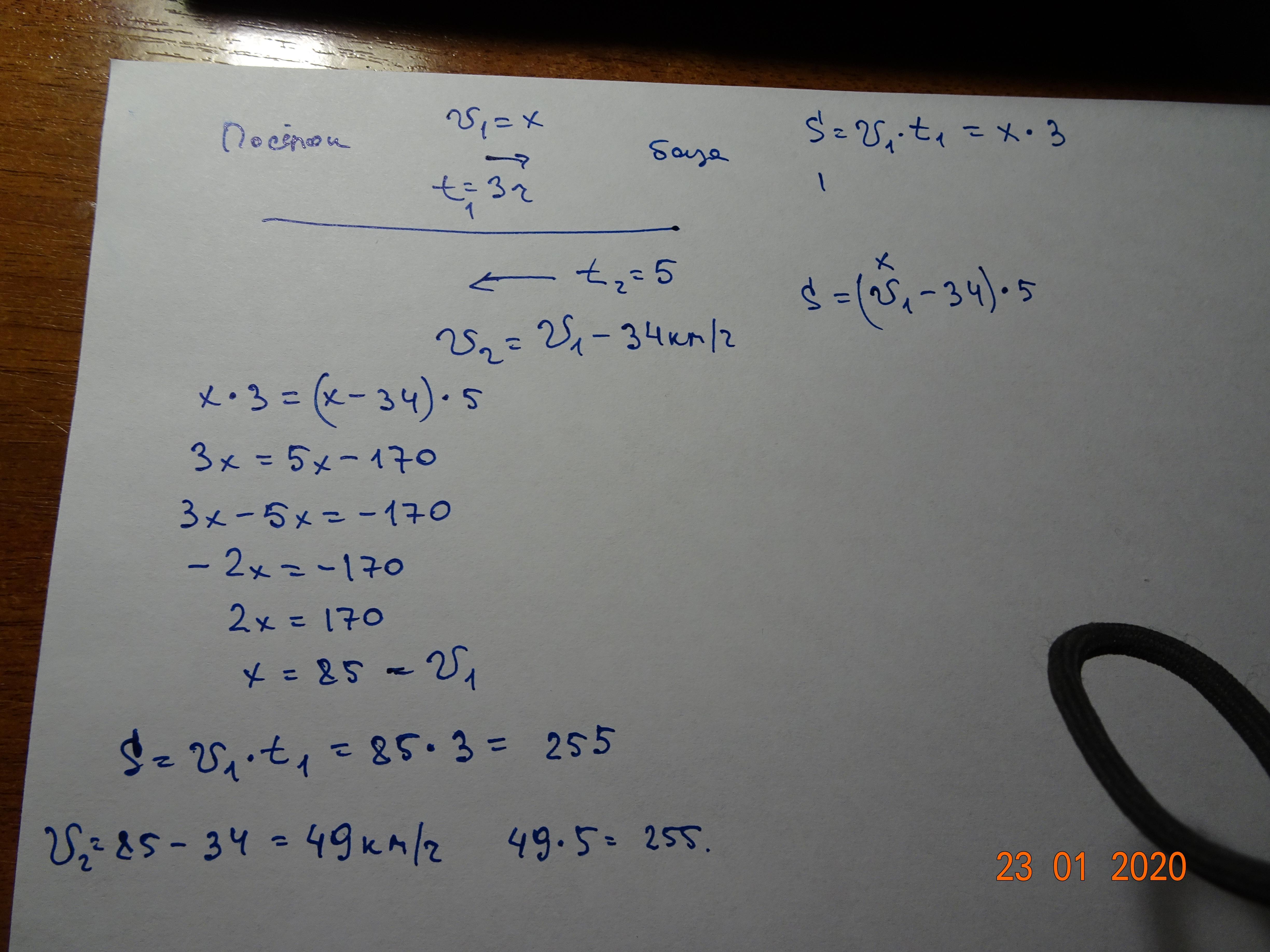 путь от посёлка до базы отдыха на катер преодолел за 3 часа.На обратном пути он уменьшил скорость на 34км/ч и вернулся в посёлок за 5 часов.Найдите расстояние от посёлка до базы отдыха