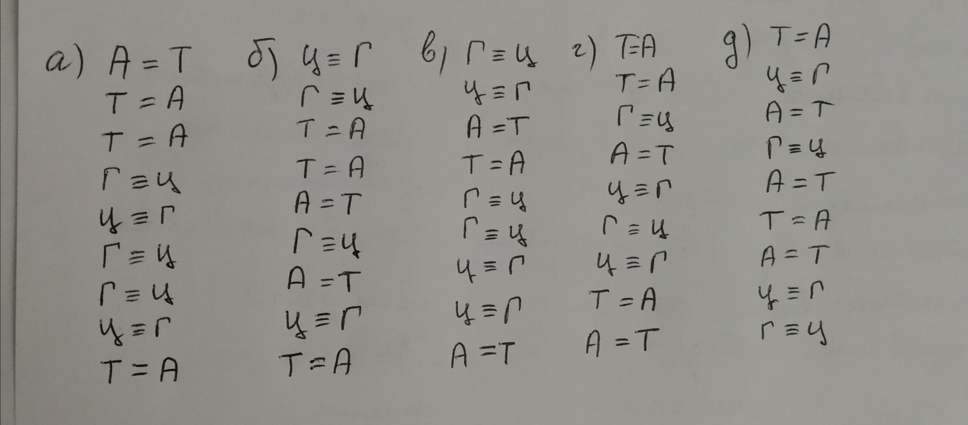 В ДНК есть следующие азотистые основания: А, Т, Ц, Г. На фотографии последовательность расположена вертикально. Черточками обозначены связи. Вторая вертикальная цепочка - это то, что нужно было "достроить".