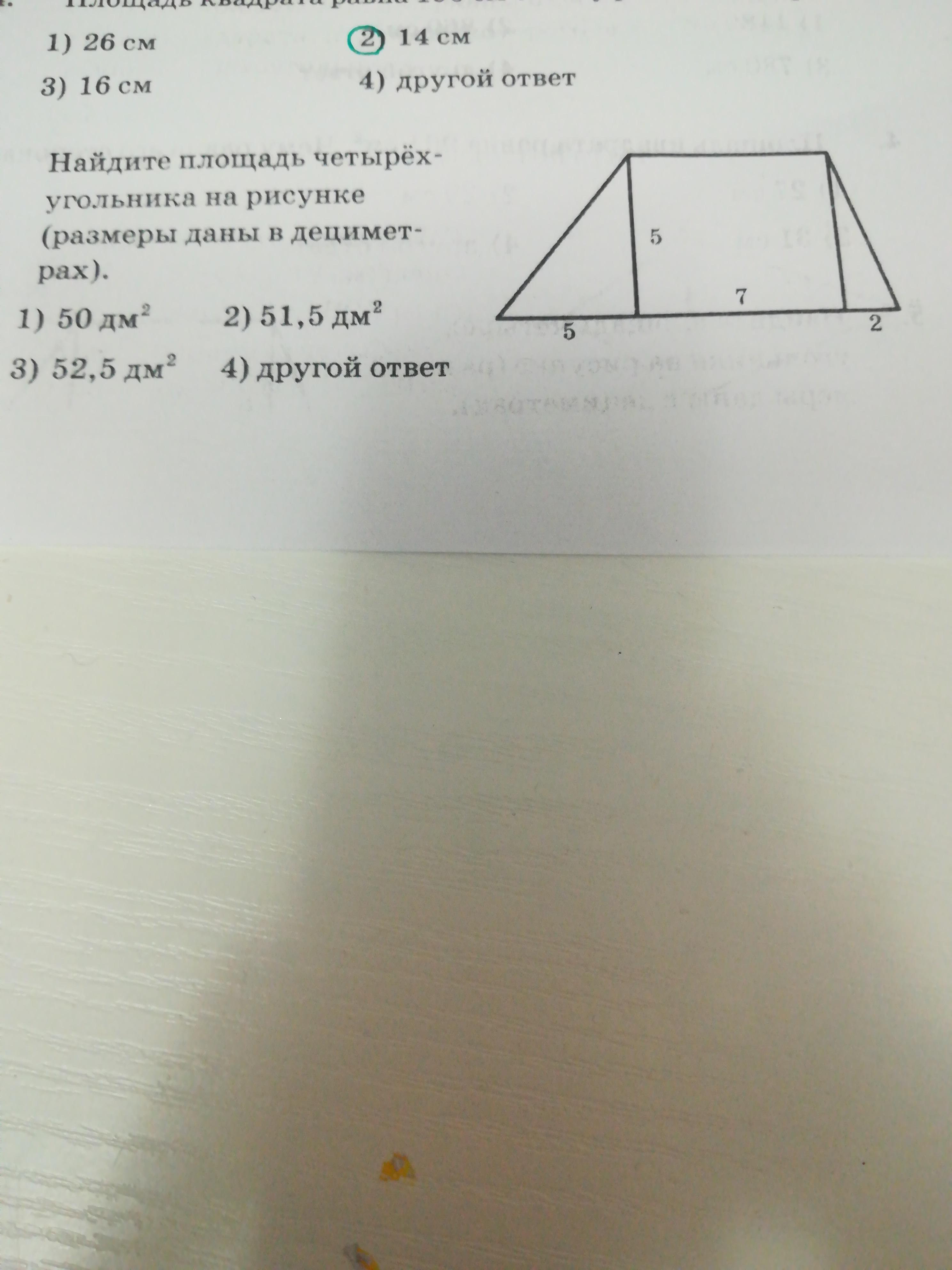 Вертикальными линиями отсечён прямоугольник, противоположные стороны которого равны. Значит, a равняется 7 дм. Нижнее основание равняется длине всех отрезков, из которых оно состоит, то есть b = 5 + 7 + 2 = 14 дм. Высота h равняется 5.