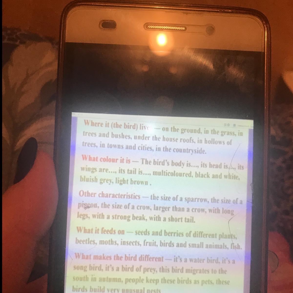 Где он (птица) живёт на деревьях и кустах, под крышами домов, в дуплах - на земле, в траве, на деревьях, в городах и поселках, в сельской местности. Какого она цвета - тело птицы ..., у нее голова, крылья ..., хвост ... разноцветный, черно-белый. голубовато-серый, светло-коричневый. Другие характеристики - размер воробья, размер свиньи, размер вороны, больше чем ворона, с длинными лепсами, с сильным клювом, с коротким хвостом. Чем он питается - семенами и ягодами разных пластов, жуками, мотыльками, насекомыми, фруктами, птицами и мелкими животными.